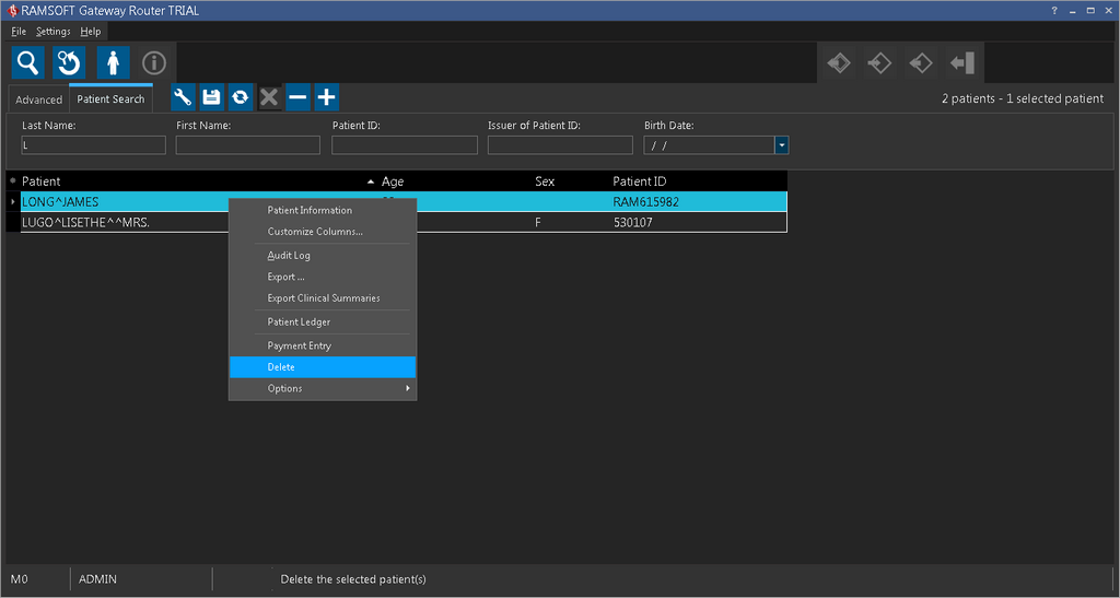 In order to view information about a patient, you will need to open the Patients search form and locate the patient in question. The Using the Search List section contains details on how to perform that task. Once the patient has been located and highlighted, right-click on the selected patient record and select Delete from the menu.