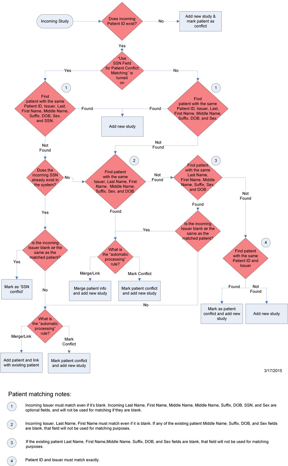 The Conflict Resolution Diagram shows the logic used by the RamSoft software to determine whether an incoming DICOM object is new or if it belongs to a patient already existing on the system.