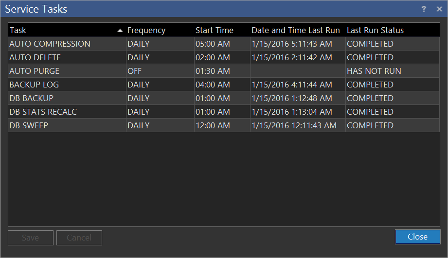 The Frequency column in the Service Task menu has two possible values for each task. The task can be run Daily, or it can be switched Off. The Start Time column indicates the scheduled time for each task. The Date & Time Last Run column displays the date and time of each task since its last execution. The time of execution might differ from the Start Time as the RamSoft Tasks Service only runs periodically. At its scheduled time, the Task service determines and executes any tasks which have not been completed within the past twelve hours. The execution interval of the RamSoft Tasks Service is defined by the DICOM Service Timer value in Maintenance.