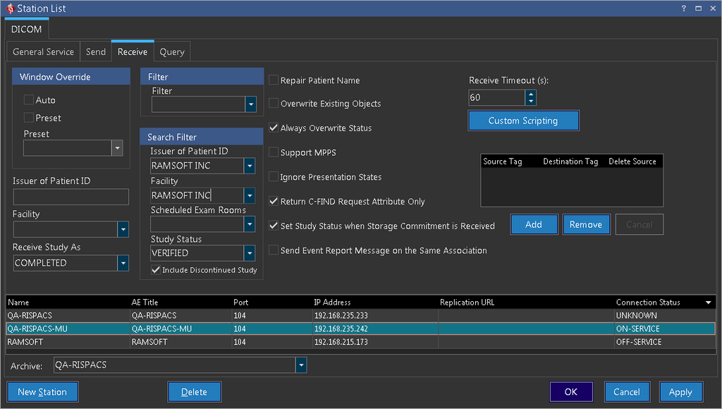 In the Receive section of the Station List you will be able to toggle options used for receiving studies from a remote destination. Any settings you toggle will only apply to studies received from the station that is currently highlighted in the list.