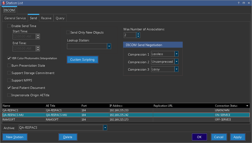 In the Send section of the Station List you will be able to toggle options that a RamSoft station uses to send studies to a remote destination. Any settings you toggle will apply only to the currently highlighted station in the list.
