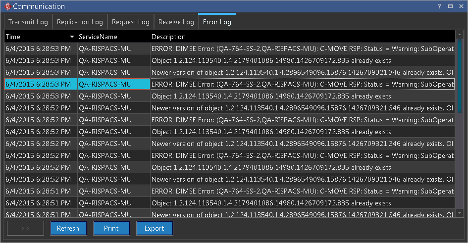The RamSoft software maintains a list of all the errors and warnings that occur during DICOM communication with other systems. This list is accessible by clicking Settings > Logs > Communication > Error Log tab.