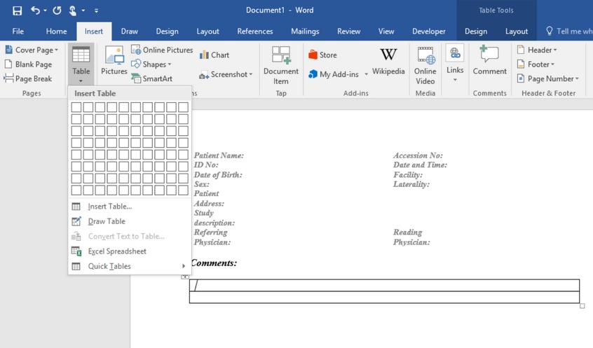 - Create a table from the Insert table tool. Put the cursor in the cell in which you would like the first image bookmark to be inserted.
