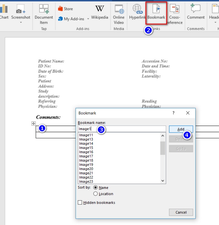 - Via the "Insert" tab, insert the name of the first Image Bookmark as appropriate and click "Add".