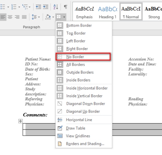 - To hide the lines of the table after inserting the desired image bookmark(s), select the table and click "No Border".