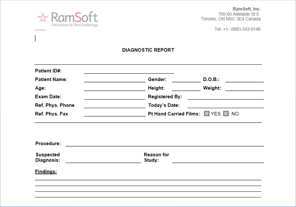The image above demonstrates a sample template. The first portion of the report is composed of several DICOM fields such as patient demographic ( Patient Name, Age, Date of birth, etc.) The main body of the report contains the performed procedures, Reason for Study, Finding notes, etc. most of these fields are automatically filled with the information when a report is created with the help of Bookmarks. These are areas that the RamSoft software will automatically populate with the corresponding DICOM information. Once the templates are created, they are uploaded in the Template Manager to be accessible in the predefined templates section.