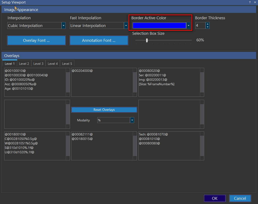When study images are displayed in the RamSoft software, they can be overlayed with annotations. These annotations display various DICOM tags, such as Patient Name and Patient ID. By default, the software displays a default set of annotations over each image, in order to associate each image with its series, study and patient. These default values can be modified if the site needs to display additional tags or remove existing ones. Modifying these default values can be performed through the Setup Viewport dialog, which allows for full customization of what the system will display over the images. This includes displaying DICOM tags as well as written text. It is launched by clicking View > Setup Viewport.