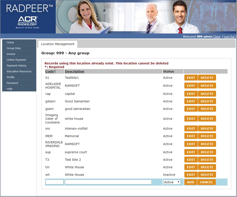 The Location Management page must be set up for successful submissions. The "Code" must be mapped to the facility for the studies that will be submitted to ACR, or the submission will fail with the message "code xyz is not valid!". For example, if the issuer is RAMSOFT and the facility name is JOE'S MEDICAL FACILITY, the Code is JOE'S MEDICAL FACILITY and the Description is RAMSOFT.