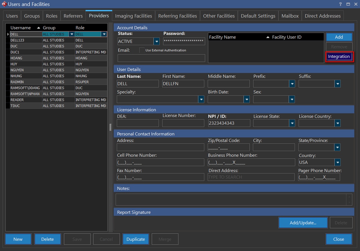 On the Integration dialog box, click Add and select the Integration name as "eRadPeer". The username of the current user will be populated under username column.