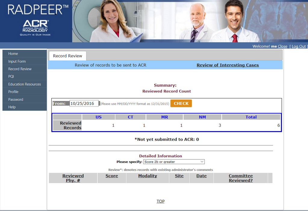 If you want to confirm the Peer review submission, log in to ACR RADPEER with the User ID and Password of the reviewer and click the Record Review option in the left panel. Enter the date to check the record and click the CHECK button.