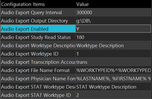 - Set the Audio Export Enabled value to "Y". By default, this value is set to "N".