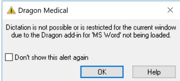 Note: if the following message is displayed in the Microsoft Word window upon opening a document, it can be ignored by clicking "OK". Dictation should resume as Dragon's Word plug-in is actually loaded already:
