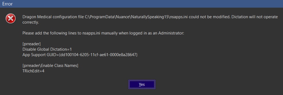 The modifications in the nsapps.ini file is required for Dragon integration to work properly with PowerReader. The nsapps.ini file is protected by default. The user needs to elevate his or her privilege in order to be able to modify the file. Once the file is modified and saved, Dragon can be launched successfully.
