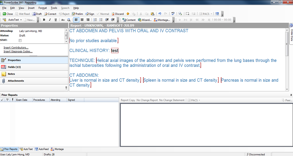 The PowerScribe Reporting window appears listing any reports for the Study.