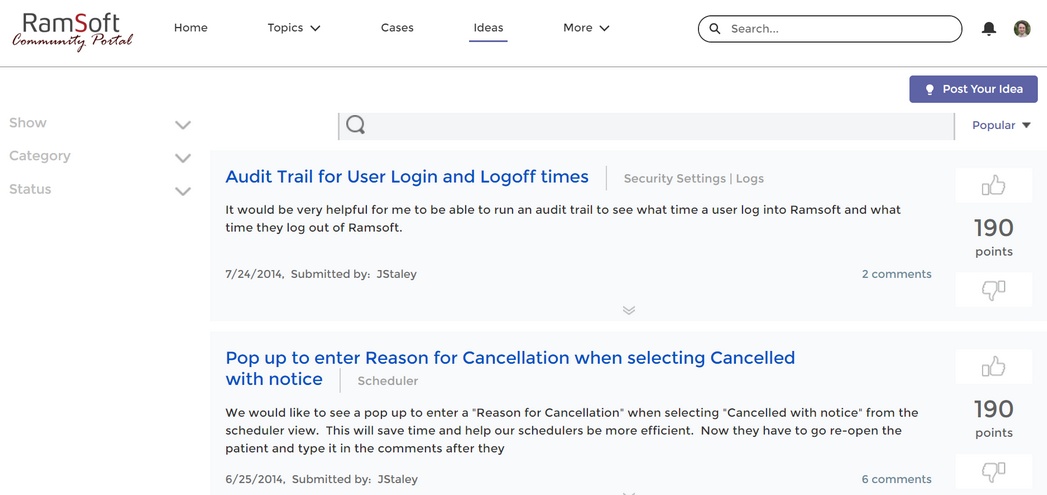 Clicking the Enhancement Request option will launch Ideas page on RamSoft's Community Portal, which can be used for searching existing ideas or sending a new enhancement request to RamSoft: