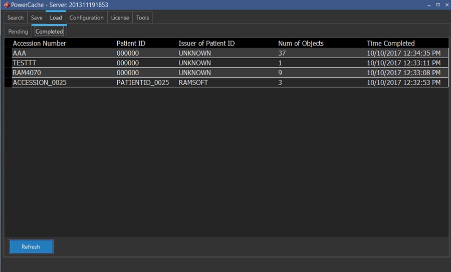 The Load tab displays studies that have been pulled to the Local Cache (via the button in the PowerReader). The "Completed" tab lists the studies that have finished loading, while the "Pending" tab lists studies that are pending to be pulled.