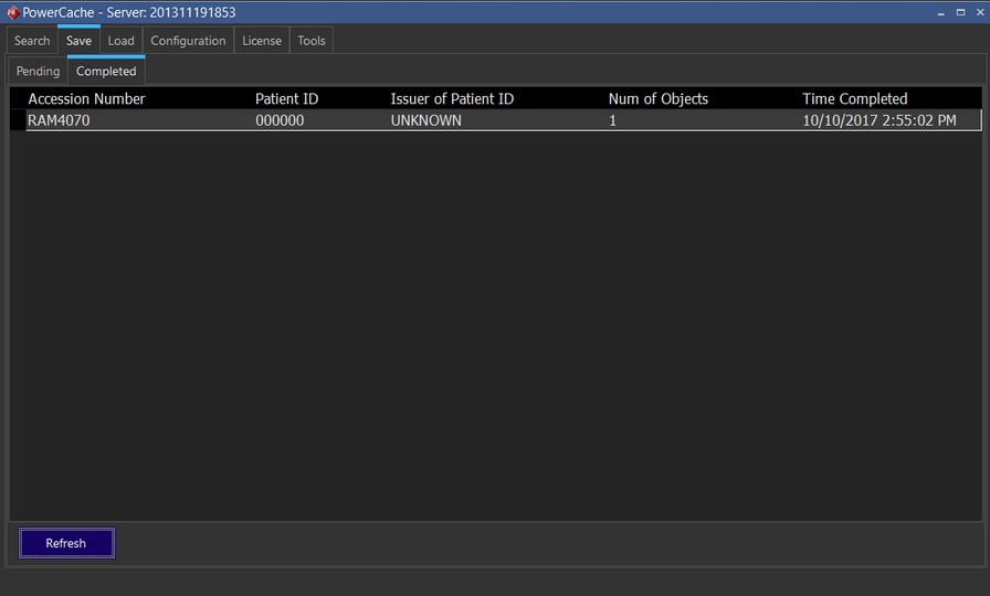 The Save tab lists all studies that have been saved to the Local Cache, as well as those that are pending to be saved. Studies that are opened, modified and closed will be in the "Completed" list once they have been loaded to the Local Cache.
