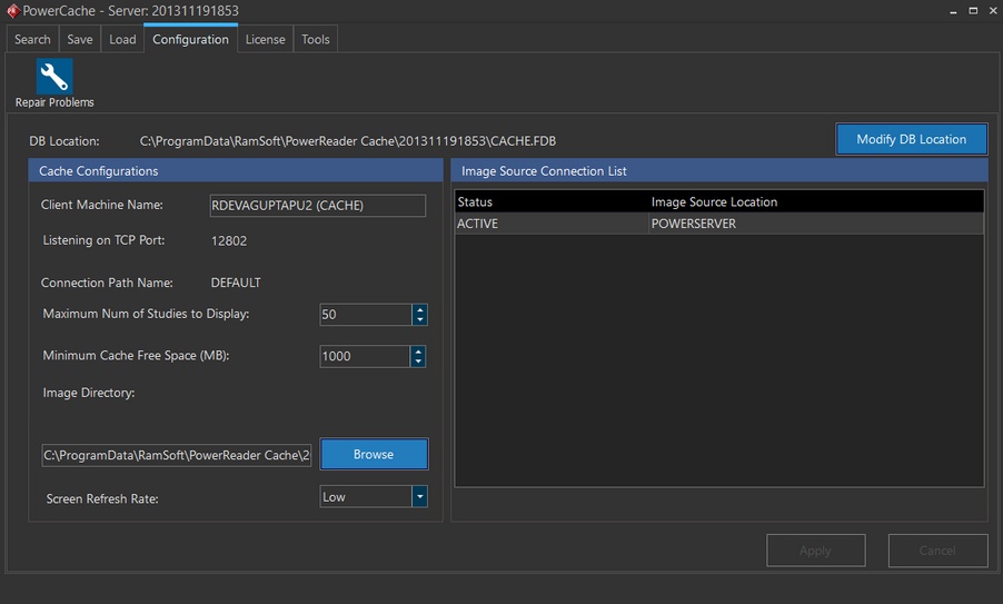 The configuration tab contain options for modifying the cache database location along with other configuration options. The "Repair Problems" icon is used to clear the PowerReader cache and perform an auto repair of the cache. See How Do I Clear the PowerReader Cache? for more details on clearing the PowerReader cache.