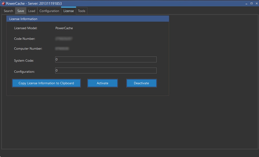 The License tab is used to enter licensing information for activating the PowerCache product.