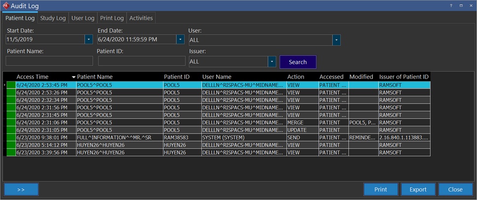 CloseThe Close button will close the Patient Level Audit Log form.