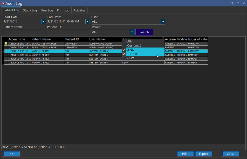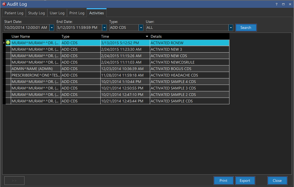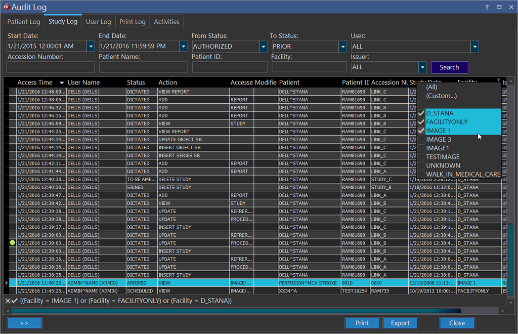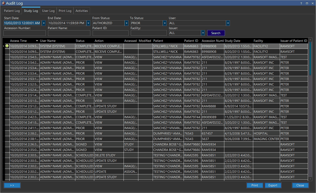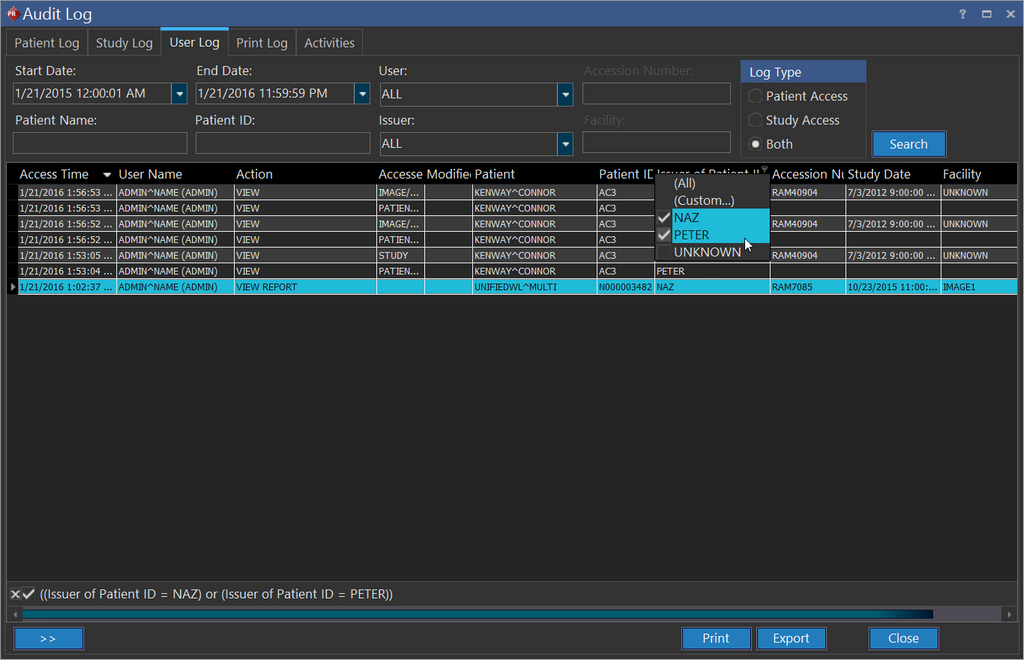 In this location, it is possible to see the Patient Log, Study Log, User Level Audit Log or a User's Print Log and Activities in one location.