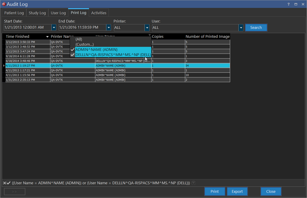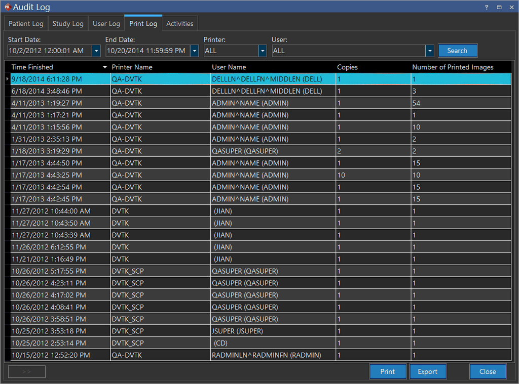 The Print Log contains a listing of all the studies that the audited user has printed to the DICOM printer over a given date range.