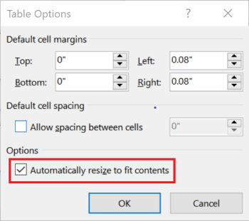 The following image shows the Table Options dialog in Microsoft Word: