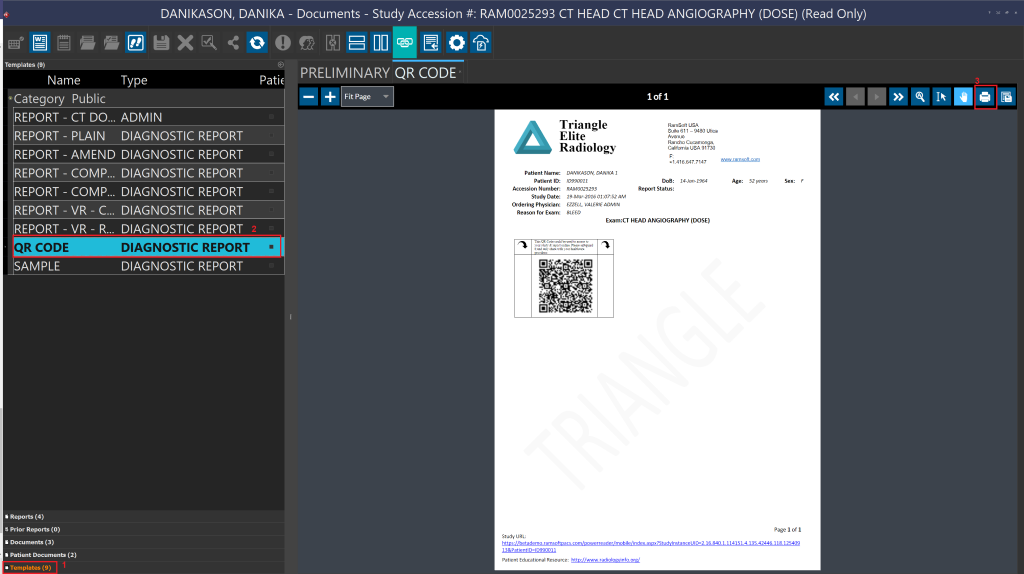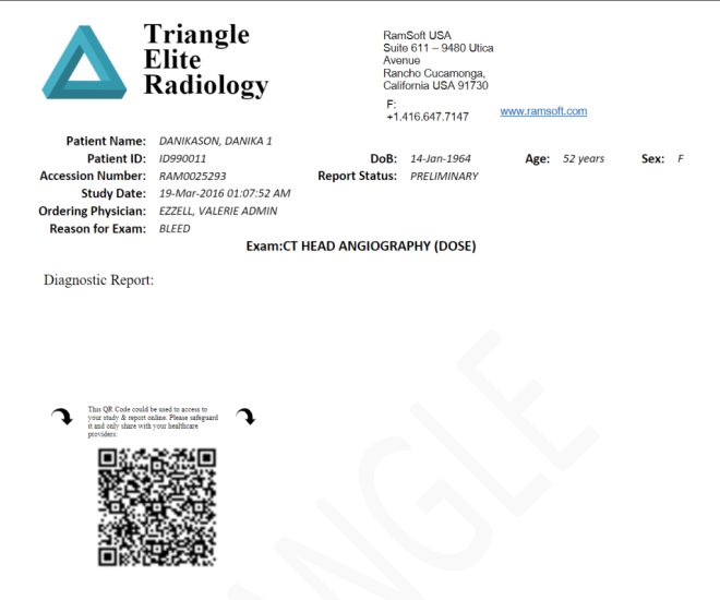 QR code can be added to a document template, which can be scanned on any mobile device to give the user access to the study and its final report through Rapid Results. This can be achieved by adding the "StudyURLQRCode" as a bookmark to any document or report template. The following is sample document with QR code: