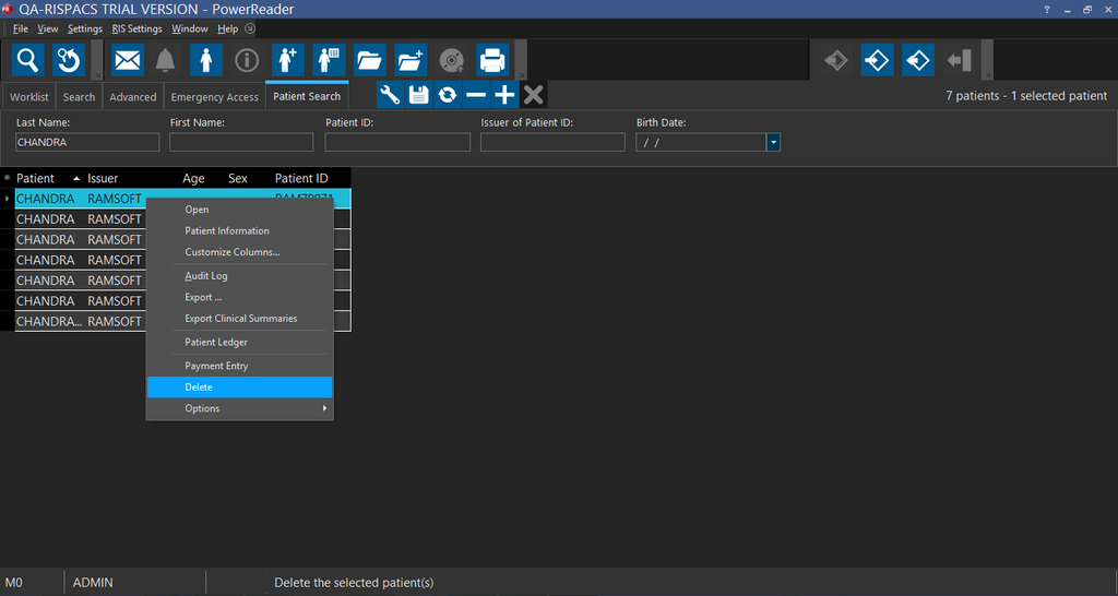 In order to view information about a patient, you will need to open the Patients search form and locate the patient in question. The Using Search section contains details on how to perform that task. Once the patient has been located and highlighted right click on the patient record and select Delete.
