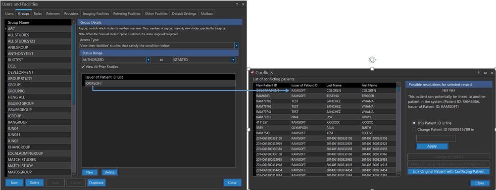 If the Issuer of Patient ID of a conflict study has been defined in the "Issuer of Patient ID List" of a Group, then members of that group will be able to see that conflict study.