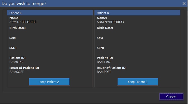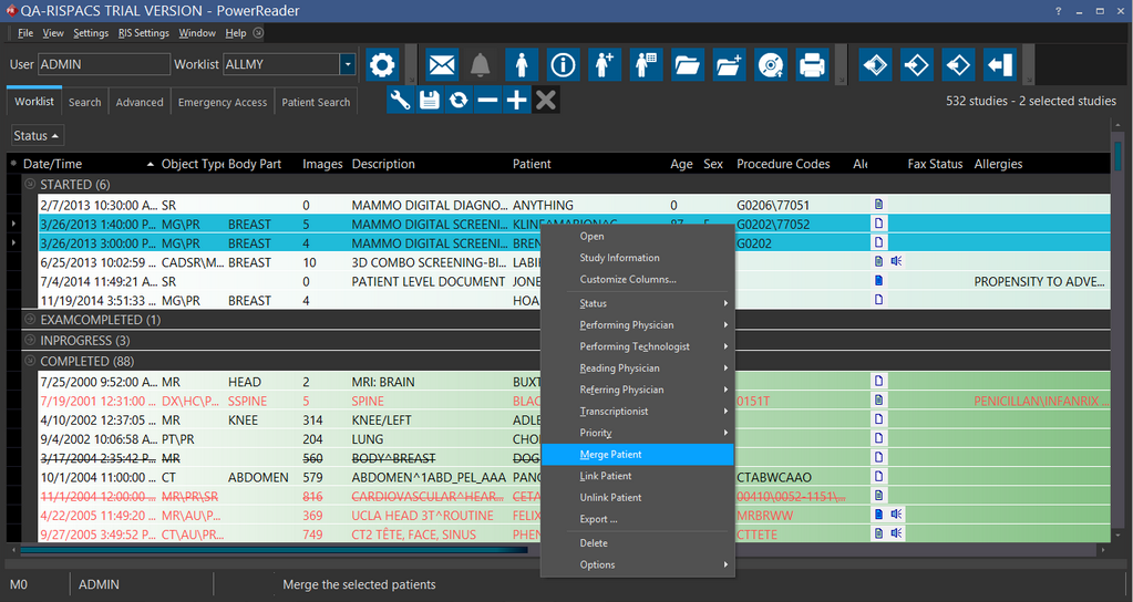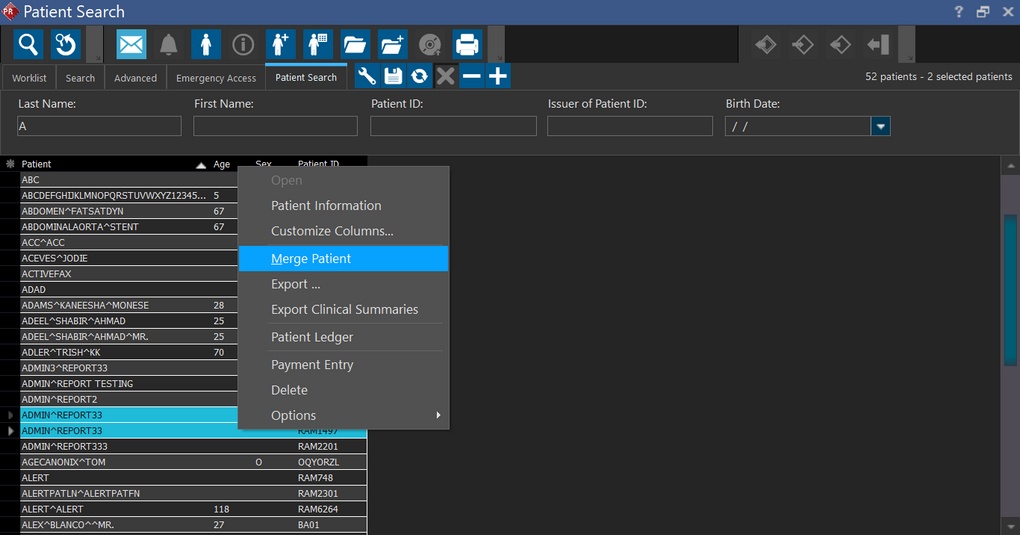 Sometimes when a patient comes in for multiple visits, the different examinations that the patient underwent are not grouped together under one patient in the system. There are two ways to merge patient data, from the Worklist or from the Patient Search page.