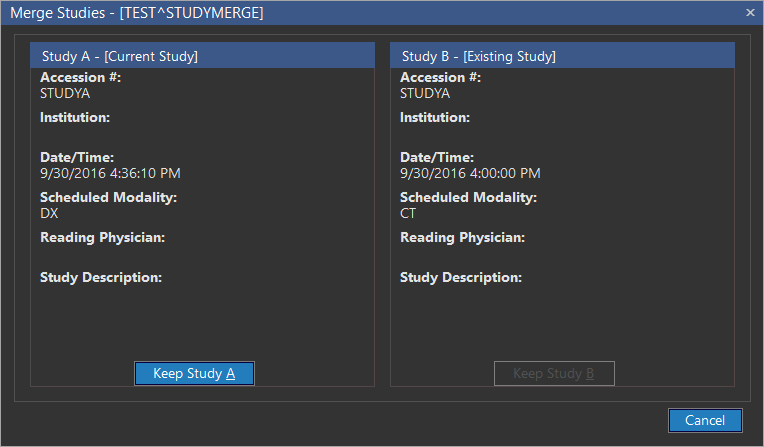 In such a situation, the user can either choose Study A which has been selected by the system or cancel the merging.