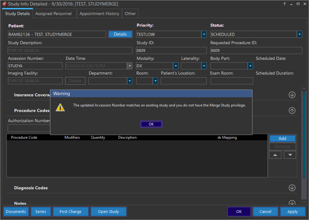When you try to update a accession number for a study with the one that matches the accession number of an existing study and try saving the changes, the message "The updated Accession Number matches an existing study and you do not have the Merge Study privilege" is displayed.