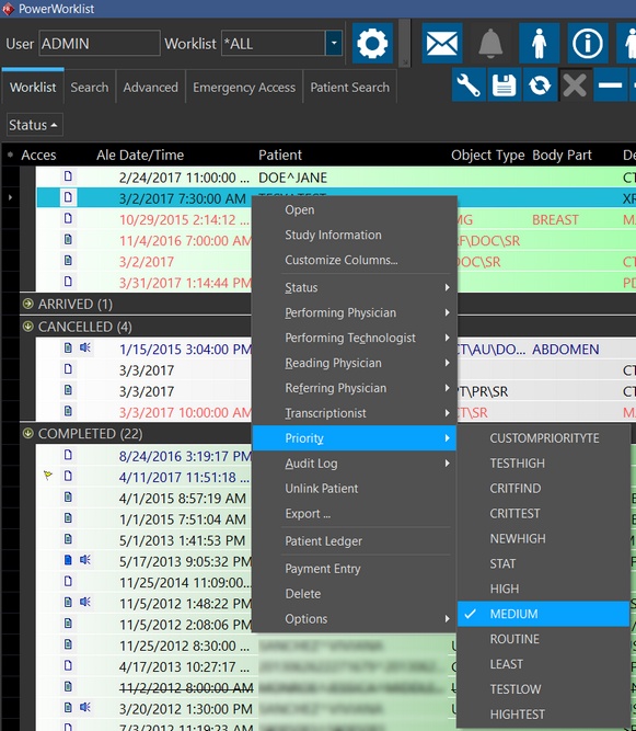 Right-click on the study in the Worklist, and select Priority from the drop-down menu. Choose the Priority you'd like the study to be changed to.