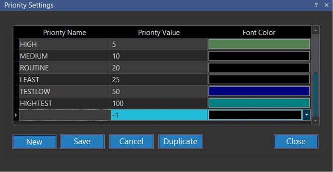 Click 'New", enter a new Priority Name and Priority Value, and choose a Font Color. Click Save when complete.