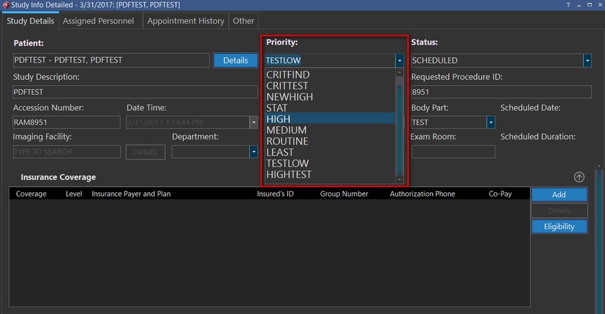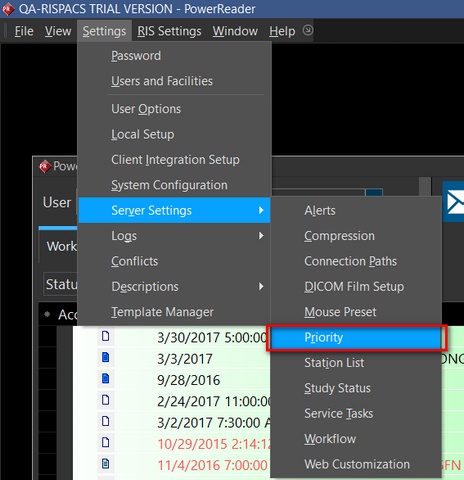 The following are default priorities that pre-exist in the system: CRITFIND, CRITTEST, STAT, HIGH, MEDIUM and ROUTINE. Alternatively, custom statuses can be added by the user. To view the list of priorities, add or modify custom priorities, click Server Settings: Priority.