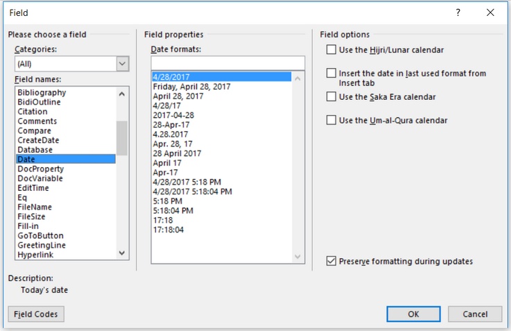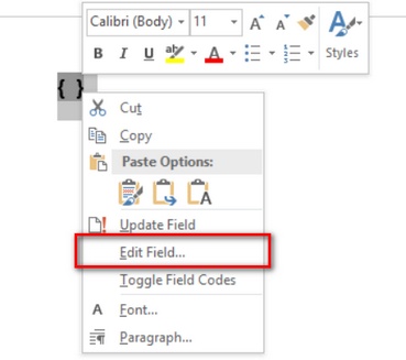 Step 3: Press the CTRL+F9 shortcut to create a field. The "" symbol for the empty field is displayed.