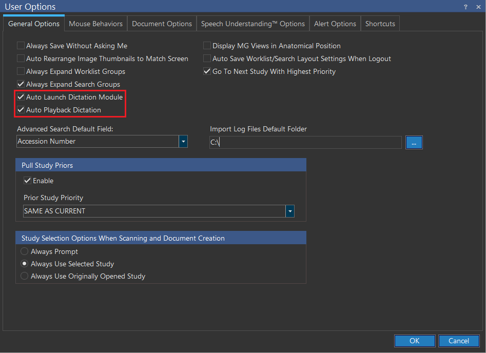 The Auto Playback Dictation option will start to playback the dictation automatically when the Dictation Module is opened.