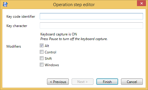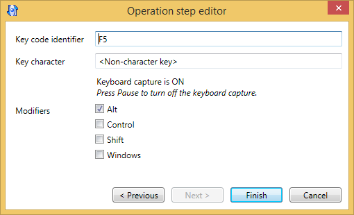 Here, while it displays Keyboard capture is ON, input the shortcut key combination. It will display in the Key Code Identifier field, and if applicable the Key Character field. The appropriate Modifiers (Alt, Control, Shift, Windows) will be checked off.