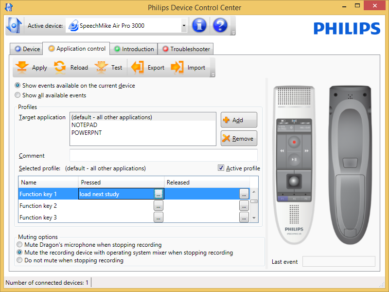 For this tutorial, the Function Key 1 on the SpeechMike will be configured to be the same as the Next Study shortcut key (Shift + F5) on PowerReader.