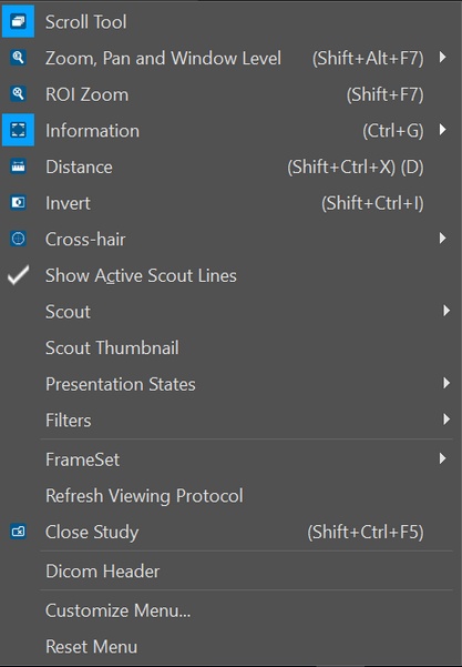 The right-click menu by default contains a list of frequently used tools. The following portrays the default menu options. The menu can be customized by clicking "Customize Menu" (second to last option) or reset to the default view by clicking "Reset Menu" (last option).