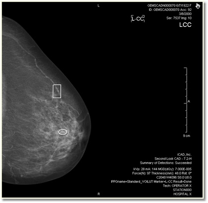 The Computer Aided Design (CAD) icon displays CAD information and CAD markers. This tool is only available for mammography studies that have CAD objects. The markers can be activated by clicking on the CAD button in the Study Desktop toolbar.