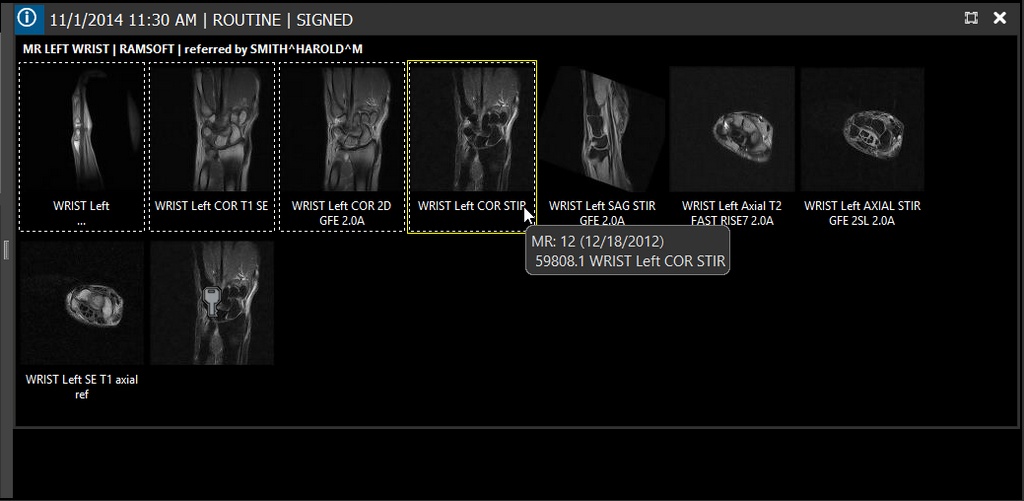For MG images, the image thumbnails display the Display View Code with a modifier followed by the Image Type 3 value below the thumbnail image. You can also see this information in the form of a hint when you hover the mouse over the thumbnail series.