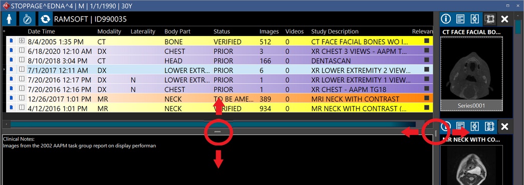 Note that you can extend the StudyGrid by dragging the splitter along horizontally view the entire grid along with its column headings. and also by dragging the bottom splitter of the StudyGrid vertically, you can view any relevant clinical notes/history for a particular study. When you exit PowerReader and login again, you can see that the splitters are in the same position as they were on your previous login.