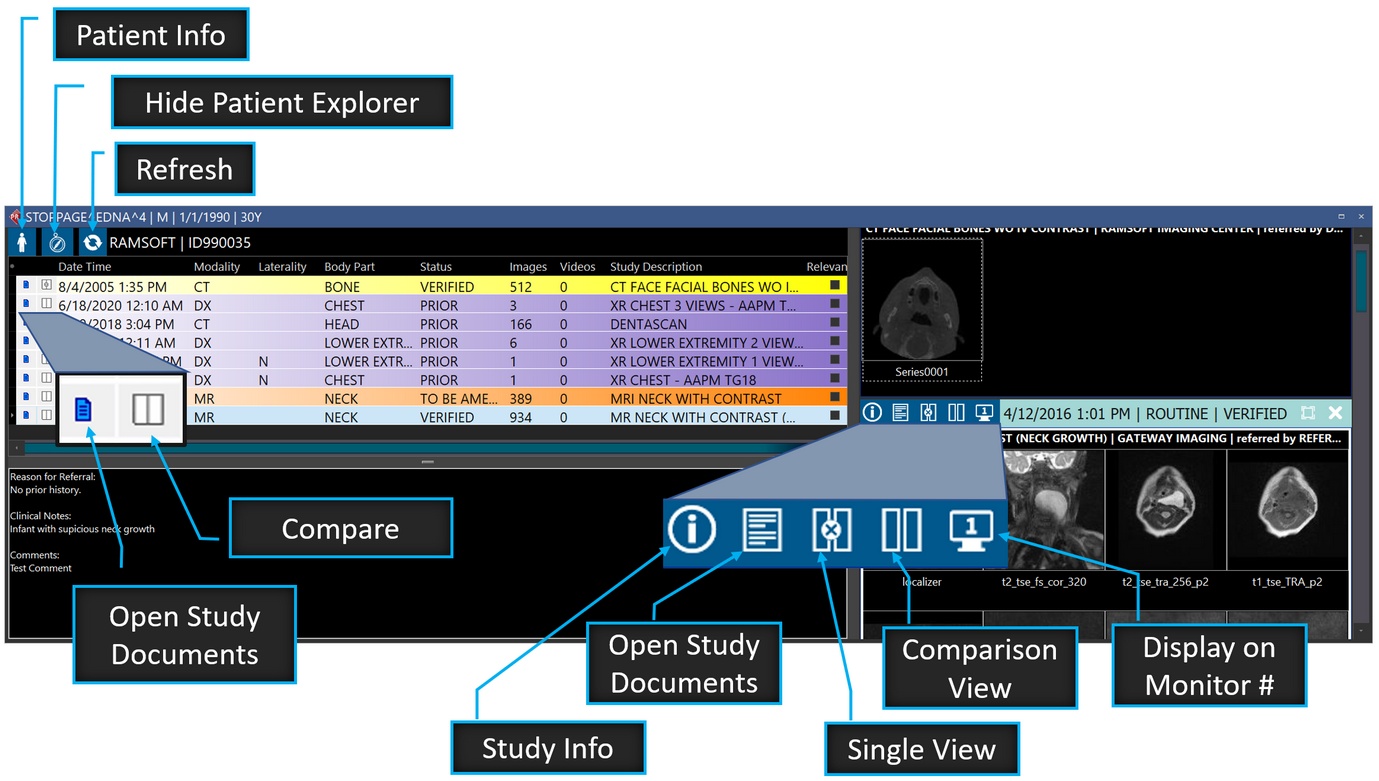 Patient Explorer lets you display multiple thumbnails for many studies without loading actual images belonging to the studies. Patient Explorer also gives you quick access to a StudyGrid displaying the study list and other linked studies belonging to the patient. You can also access comparison study documents both from the StudyGrid and thumbnails section.