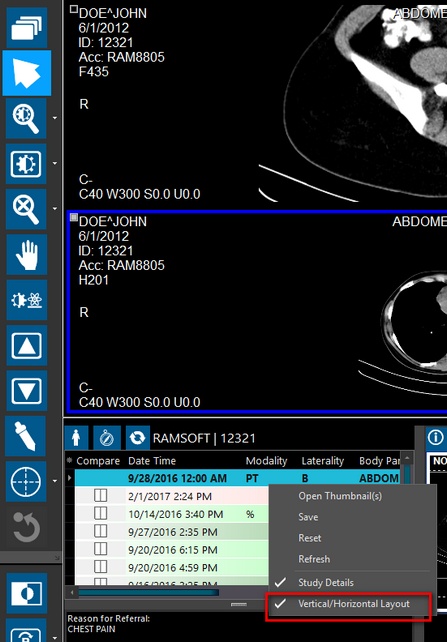 By default, the orientation/layout is set to Vertical. You can change the layout to Horizontal by un-checking the Vertical/Horizontal layout toggle option when you right-click on the study grid.