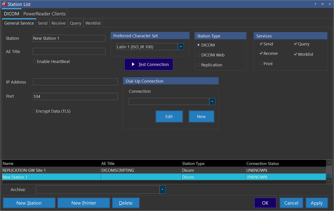 - Click Settings > Server Settings > Station List. Station List screen appears as shown below. By default, DICOM tab > General Service tab remains open.