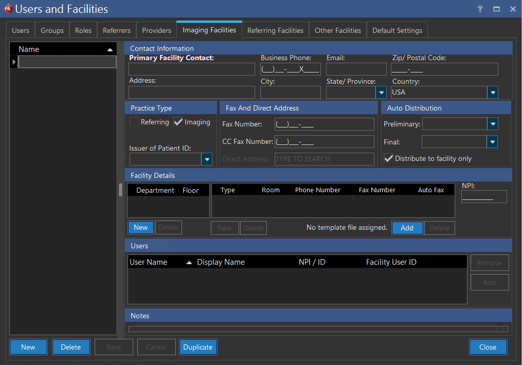 Imaging facility is a physical location where medical imaging is performed. This feature allows you create a new imaging facility and duplicate an existing facility. This imaging facilities tab comprises various sections like Contact Information, Practice type, Fax, Distribution, Facility Details, and Additional Information.