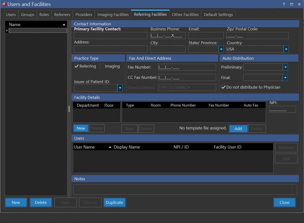 - Click Settings > Users and Facilities > Referring Facilities tab to create a new referring facility. Referring Facility tab appears as shown below.