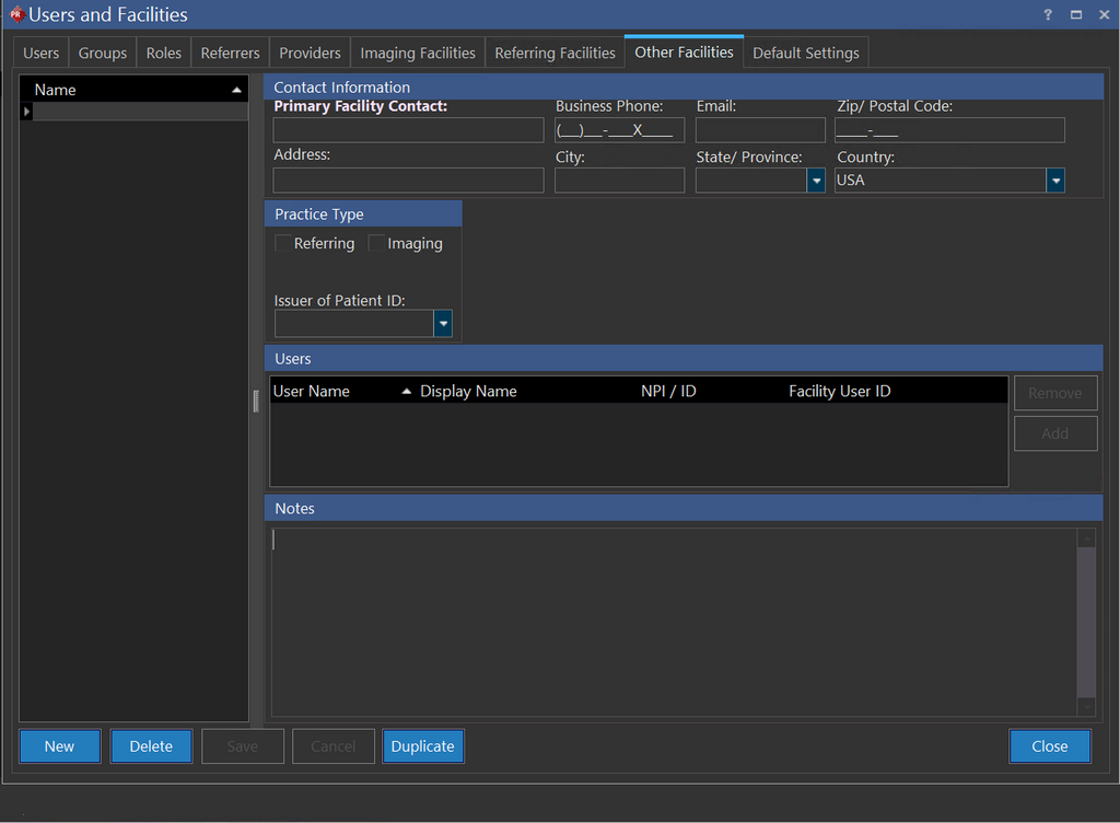 Other facilities allow you to create a reading/transcription facility. However, Other Facilities could also be used to create an imaging/referring facility and duplicate an existing facility. The imaging/referring facility created using this tab will need some more inputs to make a complete facility. This tab comprises various sections like Contact Information, Practice type, Users, and Notes.